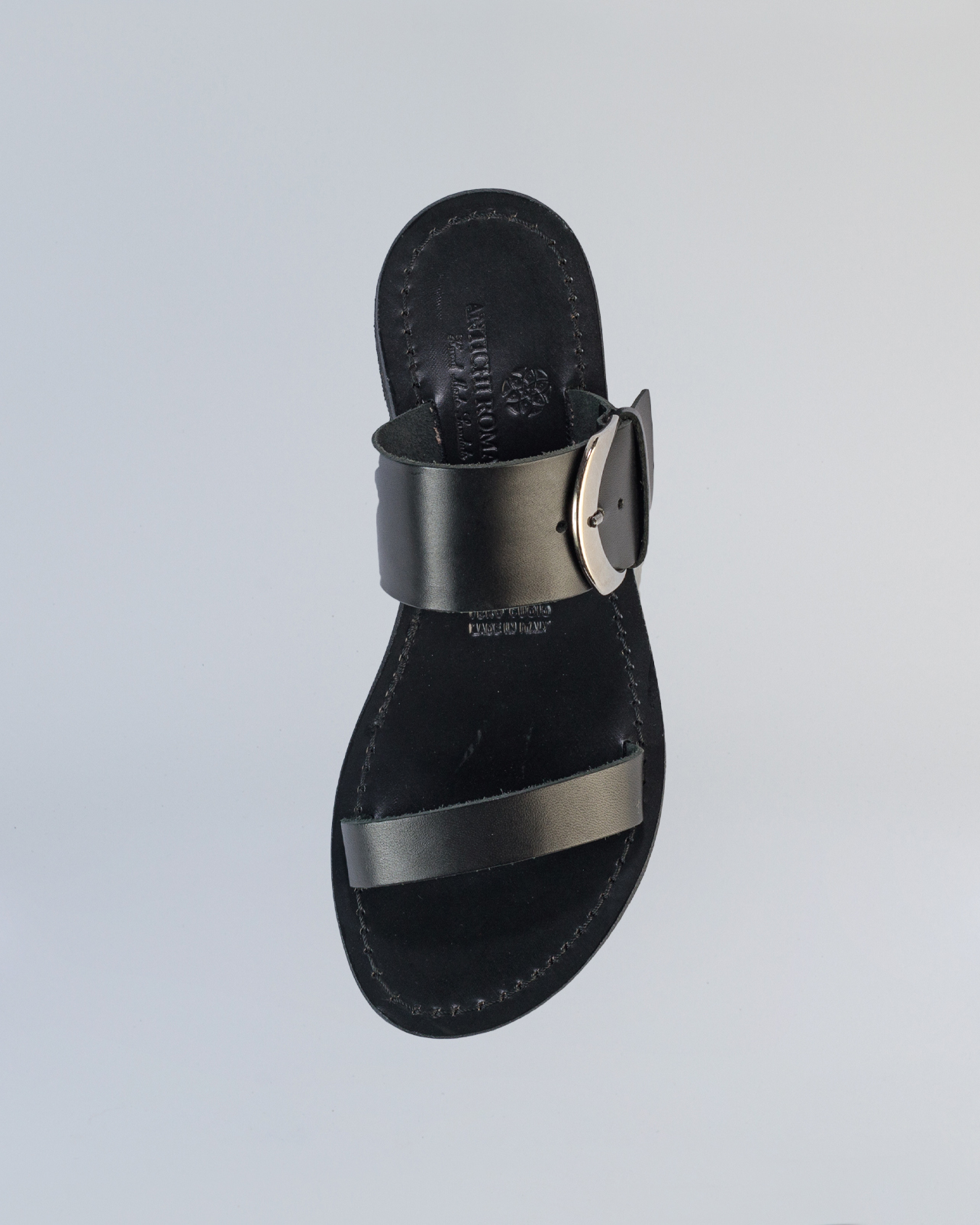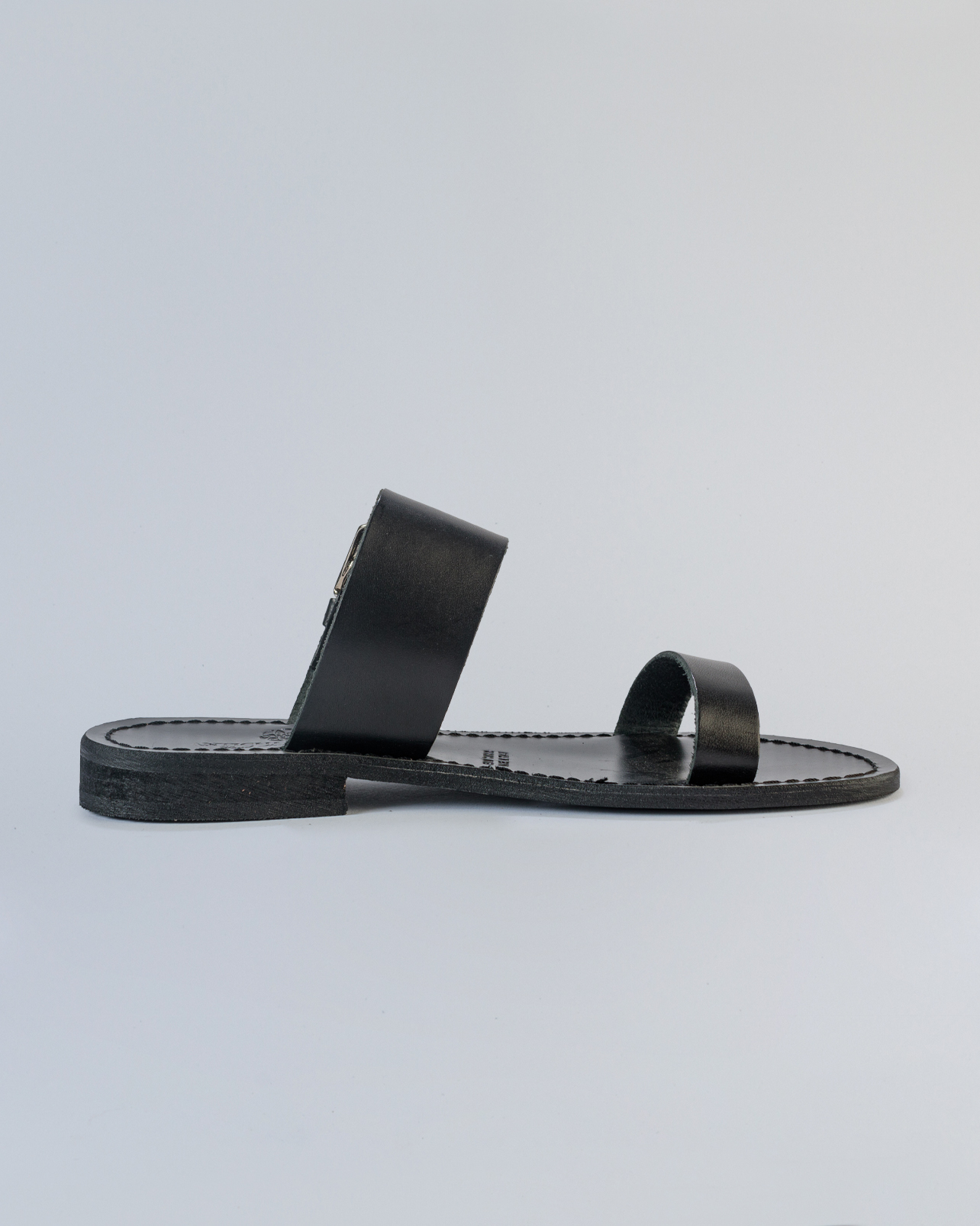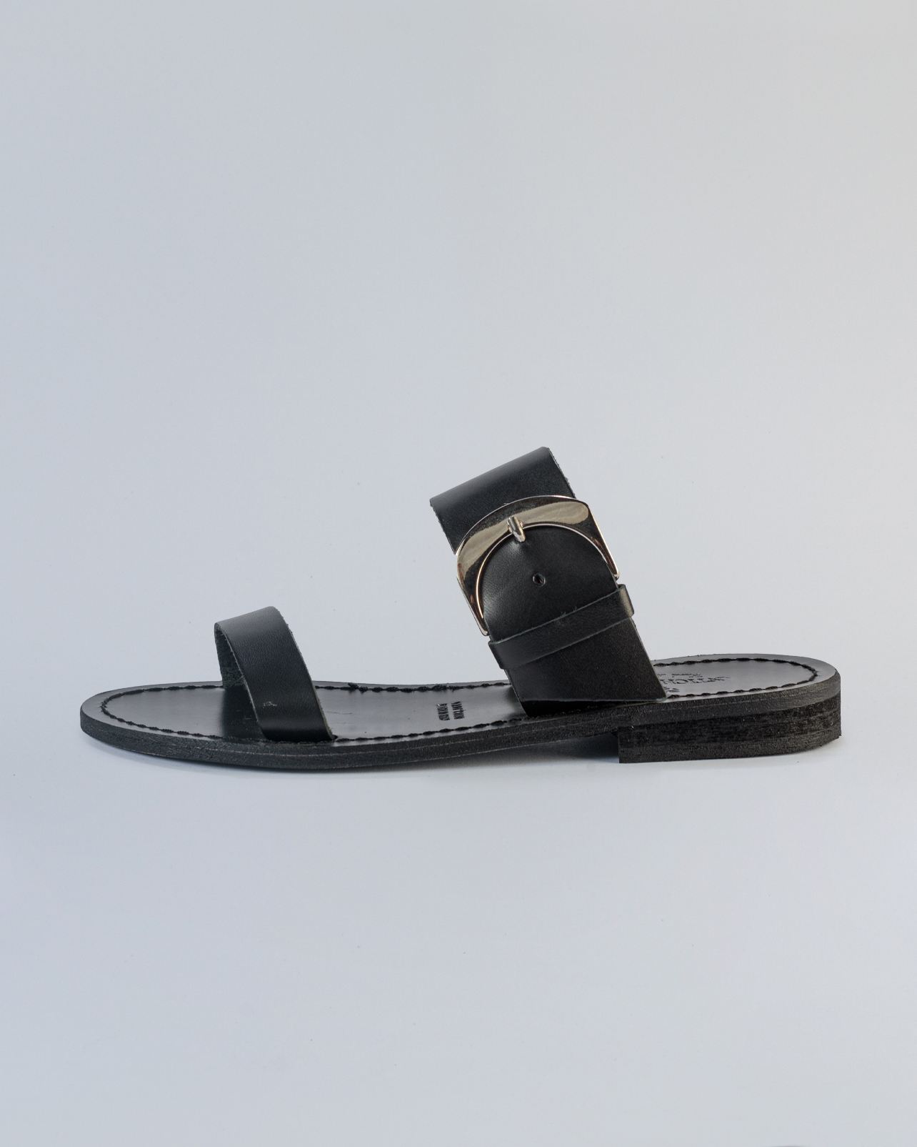 “Essenziale e sofisticato, questo sandalo in pelle è un must-have per la stagione estiva. Realizzato artigianalmente, presenta due fasce in morbida pelle liscia: una sul davanti e una più ampia sul collo del piede, impreziosita da una fibbia che aggiunge un tocco di carattere e modernità.